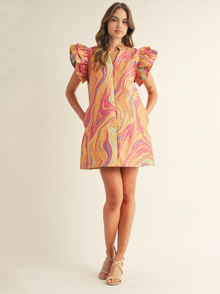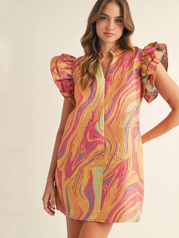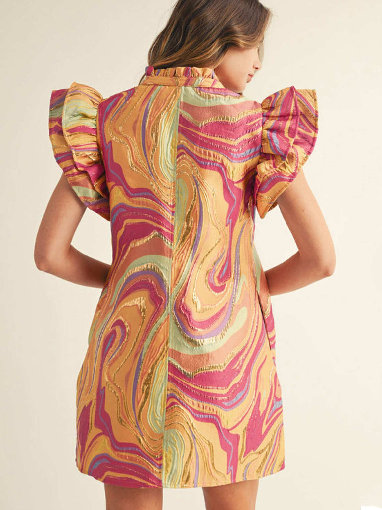 Bring the fun and flair with this eye-catching abstract jacquard dress! Featuring a swirl of vibrant pinks, oranges, golds, and teals with subtle lurex thread for a hint of shimmer, this dress is a guaranteed showstopper.